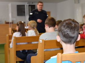 Na lekcję prawa do Sądu Rejonowego w Wołominie wybrały się dzieci z najmłodszych klas szkoły podstawowej. Uczniowie mogli spotkać się z prawdziwym sędzią, prokuratorem oraz policjantem. Podczas zajęć wysłuchali prelekcji na temat funkcjonowania wymiaru sprawiedliwości oraz zasad bezpieczeństwa, po których udali się na zwiedzanie gmachu sądu.