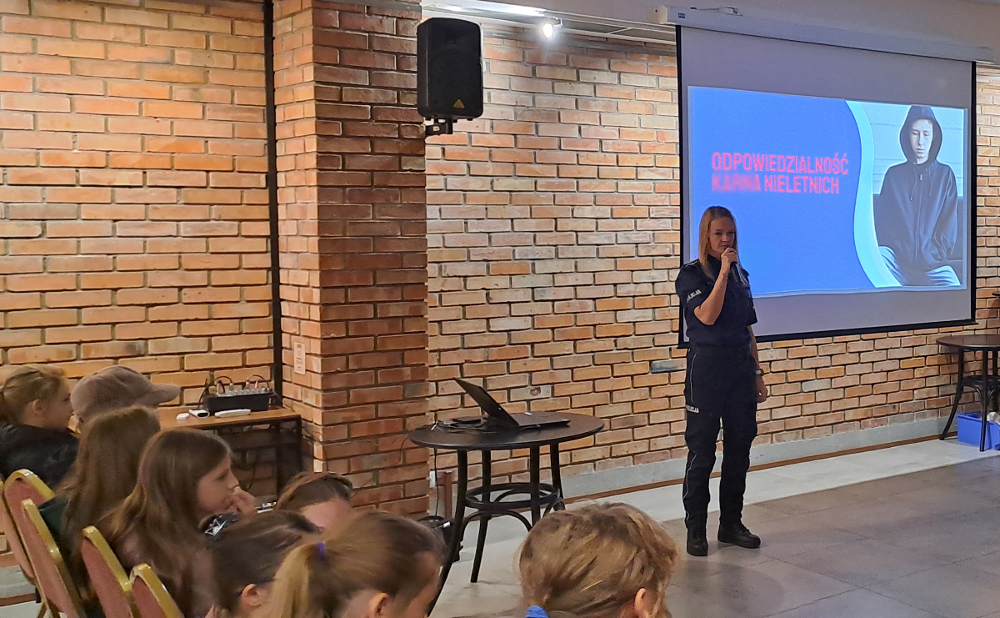 Tematem dzisiejszego spotkania policjantów z uczestnikami była odpowiedzialność prawna nieletnich w świetle ustawy o wspieraniu i resocjalizacji nieletnich. Funkcjonariuszka omówiła zagadnienia związane z odpowiedzialnością osób nieletnich za popełniane czyny karalne i za zachowania niezgodne z przyjętymi normami społecznymi. Uczniowie zostali zapoznani z podstawowymi pojęciami: nieletni, małoletni, czyn karalny, czy też demoralizacja oraz dowiedzieli się, jakie są konsekwencje prawne popełnienia takich czynów i jakimi środkami oddziaływania wychowawczego dysponuje sąd rodzinny. Wszystko to miało na celu zwiększenie świadomości młodego pokolenia w kwestii zagrożeń i konsekwencji prawnych.