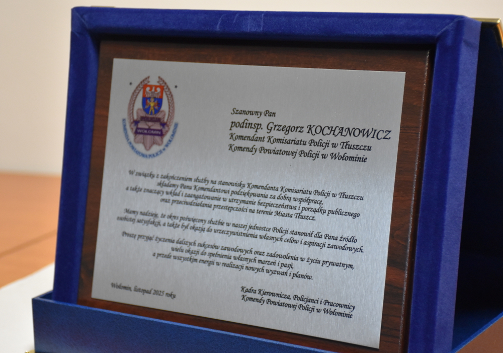 Wczoraj ( 27.11.2025. ), w związku objęciem nowych obowiązków poza garnizonem stołecznym, odbyła się uroczystość pożegnania Komendanta Komisariatu Policji w Tłuszczu podinspektora Grzegorza Kochanowicza. W imieniu kadry kierowniczej Komendant Powiatowy Policji w Wołominie inspektor Mariusz Kaszowicz w asyście I Zastępcy młodszego inspektora Andrzeja Oleksiaka, podziękował za dotychczasową służbę, współpracę, sprawne dowodzenie podległym komisariatem i życzył dalszych sukcesów w rozwoju kariery zawodowej.