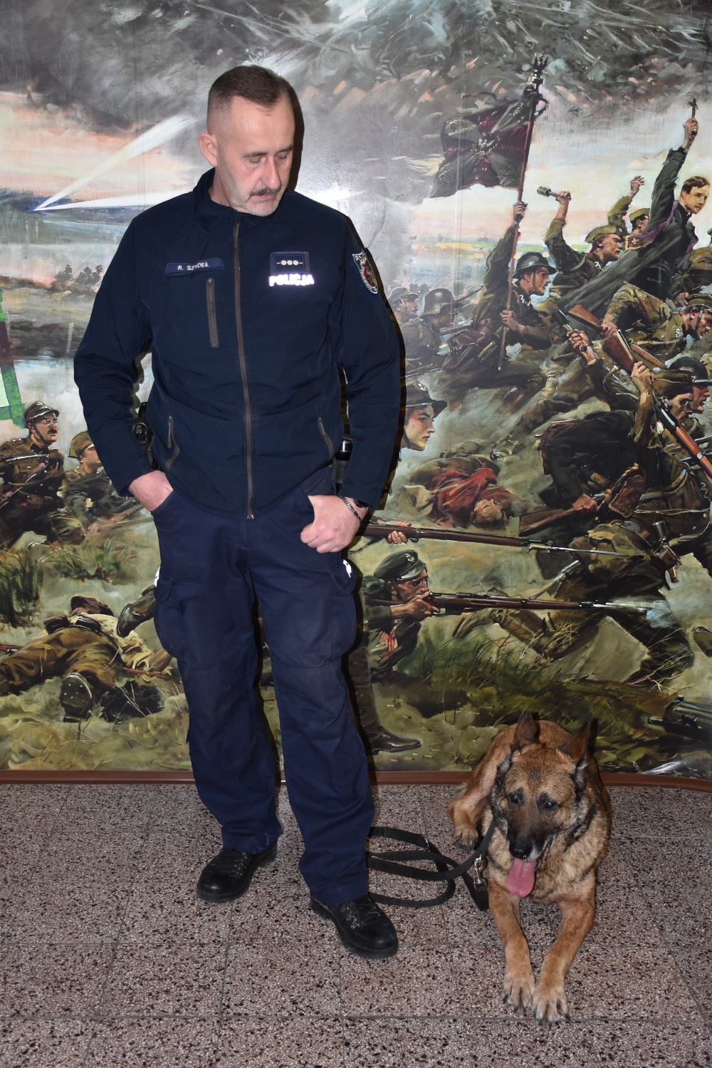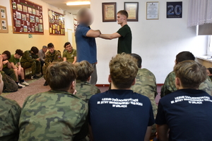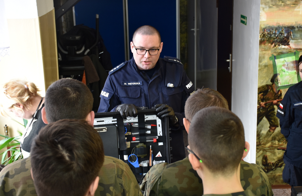 Policjanci przygotowali także dla kadetów warsztaty tematyczne. Tę część wydarzenia rozpoczęło się prezentacją tresury psa służbowego. Przewodnik zaprezentował umiejętności swojego podopiecznego, omówił zasady bezpiecznego zachowania w kontakcie z psem oraz wyjaśnił, w jakich działaniach wykorzystywane są czworonogi. Podkreślił również, że przewodnik odpowiada nie tylko za wyszkolenie psa, ale także za jego codzienną opiekę.