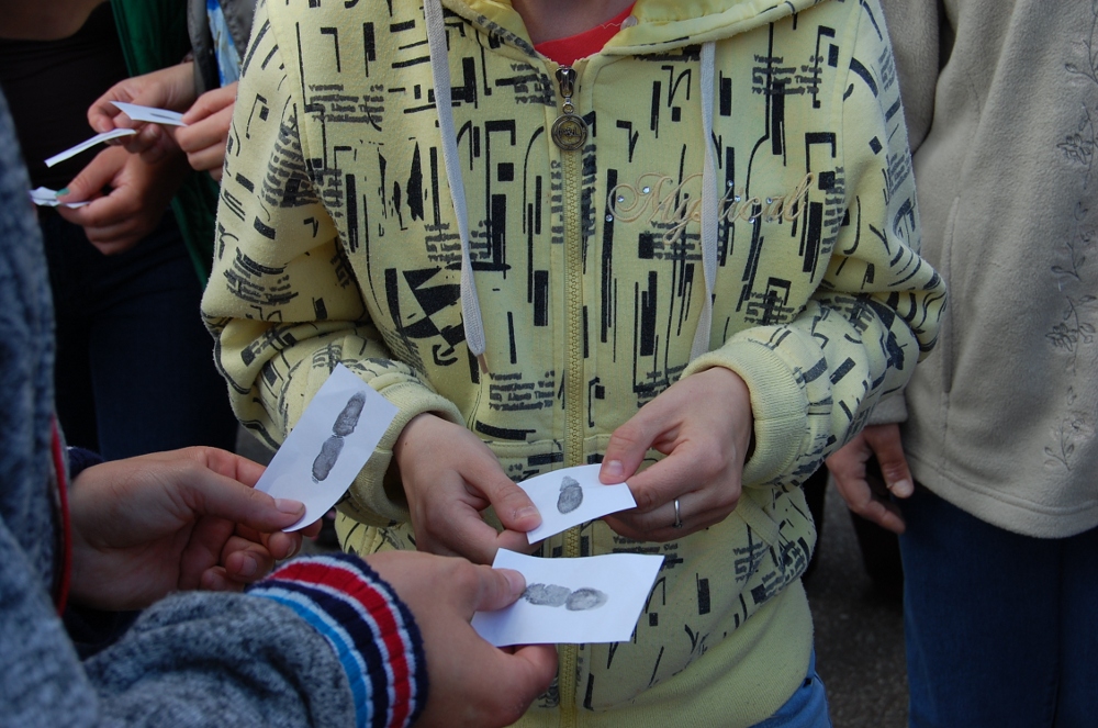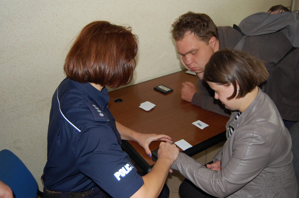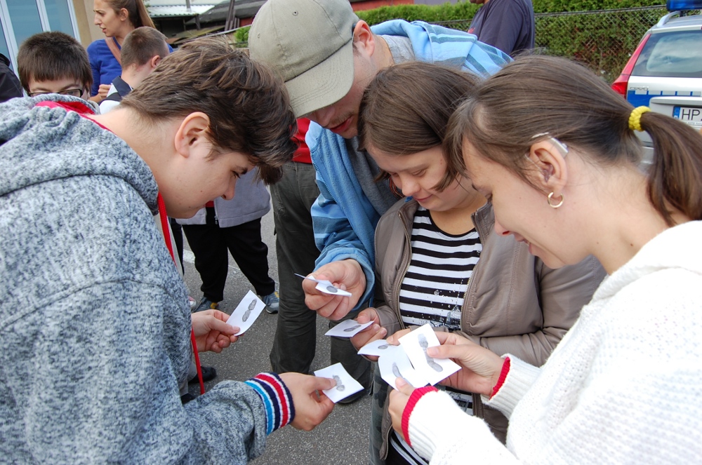 Uczestnicy Środowiskowego Domu Samopomocy z dużą pasją odbijali linie papilarne. Później porównywali odbicia palców, szukając różnic i podobieństw.