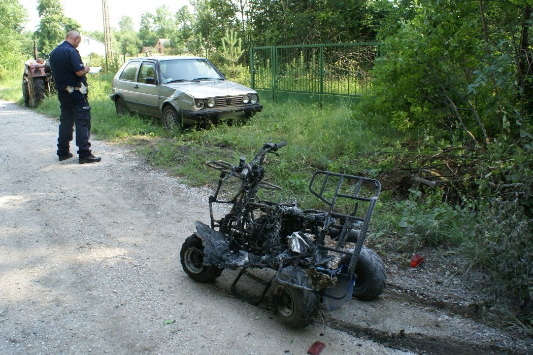 Nieoczekiwanie taki sam manewr wykonał 14-latek wjeżdżając wprost pod koła vw. Zaraz po zdarzeniu quad stanął w płomieniach. Na miejsce skierowano dwie karetki pogotowia oraz śmigłowiec ratownictwa medycznego. Chłopiec z poważniejszymi obrażeniami w stanie nieprzytomnym drogą powietrzna został przetransportowany do szpitala. Dziewczynka lżej ranna również trafiła do tego samego szpitala. Policjanci sprawdzili stan trzeźwości kierowcy vw 23-letniego Krzysztofa K. Badanie wykazało u niego blisko 0,28 promila. Funkcjonariusze wołomińskiej drogówki sprawdzają okoliczności wypadku. Apelujemy o rozwagę i należytą opiekę nad dziećmi podczas trwających wakacji.