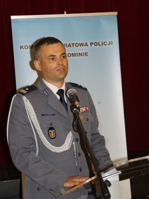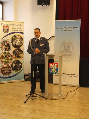 Komendant Powiatowy Policji w Wołominie podinspektor dr Marek Ujazda podczas swoje przemówienia powiedział, że policjanci są przeważnie w samym centrum wydarzeń. Są tam po to, by bronić człowieka, by wspierać, by strzec prawa, by chronić. Dobrze, że w tej całorocznej, niełatwej pracy policjanta, jest taki jeden dzień, w którym to my możemy się poczuć najważniejsi, dumni, kiedy to my i nasza służba może być w centrum uwagi. To pozwala nam naładować baterię, wzmocnić się, upewnić że jesteśmy we właściwym miejscu w życiu. Jak zaznaczył komendant Ujazda, ten dzień to szczególny dzień dla policjantów Komendy Powiatowej Policji w Wołominie, bo mogą na chwilę zatrzymać się w tym biegu i poczuć najważniejszymi. To poczucie zadowolenia potęguje fakt, że w tym dniu towarzyszą im szczególne osoby takie jak Komendant Stołeczny Policji, którego obecność jest dowodem uznania i poparcia naszych działań a awanse, nagrody i wyróżnienia otrzymane z jego rąk szczególnie wzmacniają tę radość. Podinspektor Marek Ujazda nawiązał też do obchodzonego w bieżącym roku 100-lecia odzyskania niepodległości przez Polskę oraz szczególnej roli policjantów walczących za niepodległą Polskę.