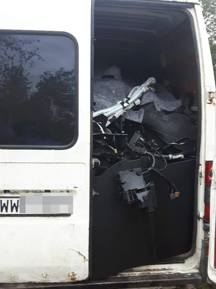 Funkcjonariusze postanowili to sprawdzić. Podczas dojazdu pod wskazany adres, policjanci zauważyli wyjeżdżający z posesji dostawczy samochód. Postanowili poddać kontroli fiata. W kabinie samochodu znajdowało się dwie osoby 30 i 40-latek. Gdy tylko kryminalni sprawdzili część ładunkową, ujawnili podzespoły nadwozia i wyposażenia samochodu nissan x-trail. Mężczyźni nie byli w stanie wytłumaczyć skąd je posiadają. Dalsze szczegółowe przeszukanie dostawczego pojazdu to odnalezione: moduł komputerowy, kluczyk z pilotem od samochodu nissan oraz wycięty element nadwozia i tabliczka znamionowa z numerem VIN. Po sprawdzeniu okazało się, że pochodzą ze skradzionego 6 września na terenie Niemiec nissana x-trail, którego wartość została oszacowana na kwotę 138 tys. złotych.