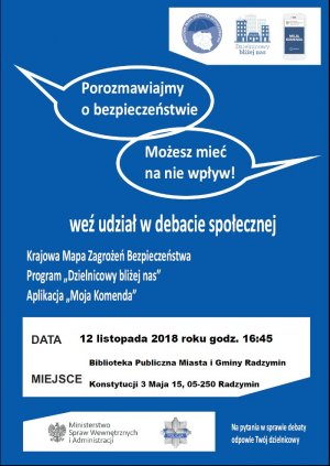 12 listopada 2018r o godz. 16:45 w Bibliotece Publicznej Miasta i Gminy Radzymin przy ulicy Konstytucji 3 Maja 15, odbędzie się kolejna już w tym roku debata społeczna z mieszkańcami pn. „Porozmawiajmy o bezpieczeństwie – możesz mieć na nie wpływ”. Komendant Komisariatu Policji w Radzyminie , Burmistrz Radzymina i Wójt Dąbrówki serdecznie zapraszają mieszkańców Radzymina i Dąbrówki do czynnego udziału w spotkaniu w nowej formule, dotyczącym bezpieczeństwa publicznego.
