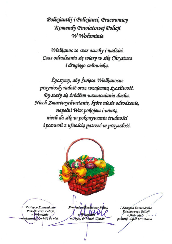 Policjantki i Policjanci, Pracownicy Komendy Powiatowej Policji W Wołominie. Życzymy, aby Święta Wielkanocne przyniosły radość oraz wzajemną życzliwość. By stały się źródłem wzmacniania ducha. Niech Zmartwychwstanie, które niesie odrodzenie, napełni Was pokojem i wiarą, niech da siłę w pokonywaniu trudności i pozwoli z ufnością patrzeć w przyszłość.